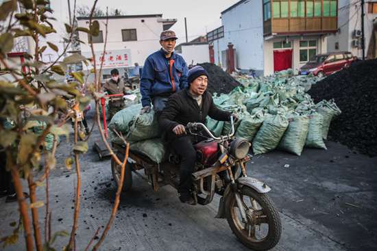 2017年11月19日,安新县大田庄村,村民正在装清洁煤。这个冬季,雄安新区采取“气代煤”“电代煤”,推广生物质燃料等措施,保障农村清洁取暖。