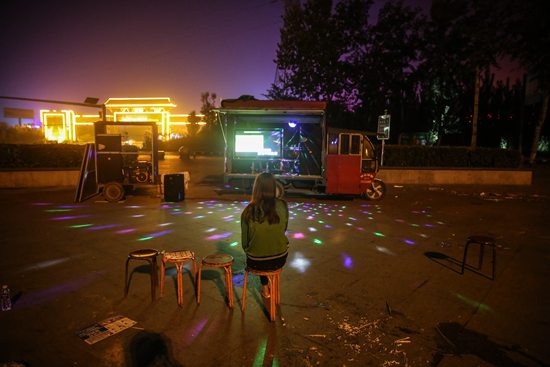 2017年9月12日晚,容城县三贤文化广场上,一名女孩在露天KTV唱歌。