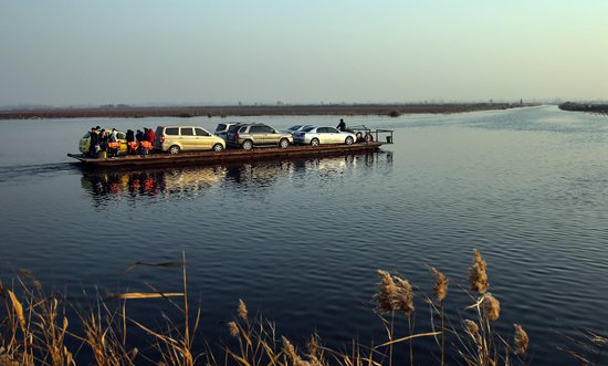 2017年11月20日,白洋淀安新县端村渡口,一艘满载的渡船驶向对岸的杨刘庄村。