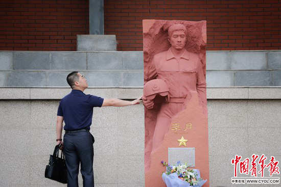 5月11日,一位战友轻抚李月的塑像。中国青年报·中青在线记者 王鑫昕/摄