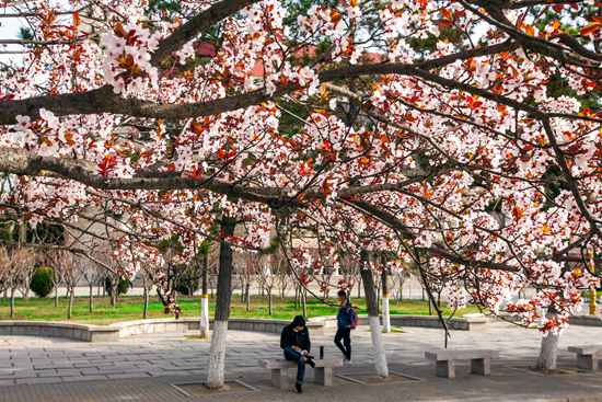 烟台大学校园内碧水依依,大学生们在美丽的三元湖畔认真晨读,乐享“阅读的春天”。视觉中国供图