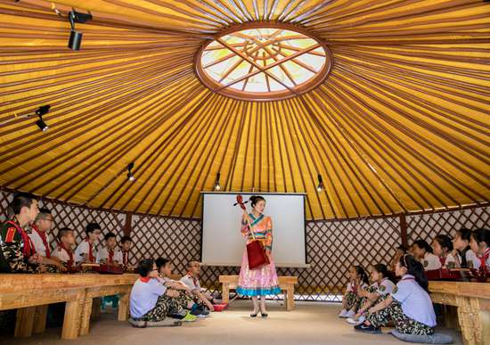 5月17日,呼和浩特市玉泉区五塔寺东街小学学生在内蒙古马头琴艺术博物馆参观。国际博物馆日将至,人们纷纷走进博物馆,感受博物馆展品的魅力。