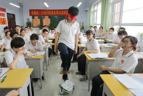 5月17日,衡水市第二中学高三学生在教室里做“跨越障碍”游戏。距2018年全国高考还有不到一个月,河北省衡水市第二中学帮助学生释放紧张情绪,以自信乐观的心态迎接高考。新华社记者 朱旭东/摄
