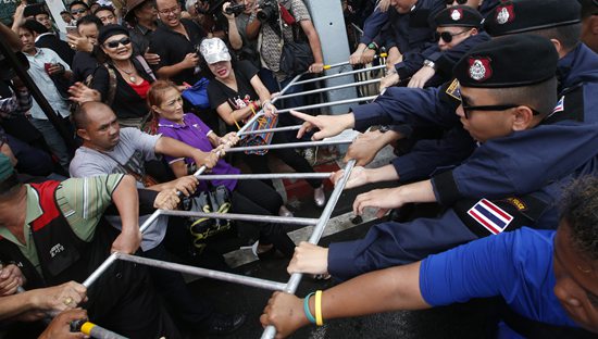 5月22日,在泰国曼谷,抗议者与警察对峙。近千名泰国民众22日上午在曼谷法政大学王家田校区举行集会,表达对泰国政府拖延大选时间的不满,并呼吁政府在年内启动大选。