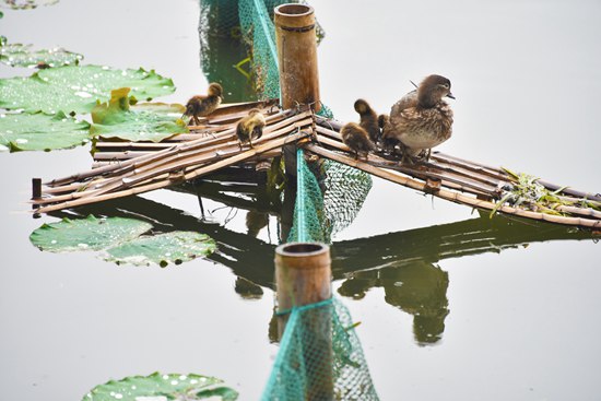 5月18日,杭州西湖,护鸟公益人士架起“爱心桥”,帮助鸳鸯宝宝跨越荷塘的围网。视觉中国供图