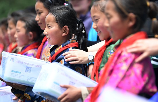6月20日,甘肃省甘南藏族自治州夏河县吉仓乡中心寄宿制小学的孩子领到“HELLO小孩”爱心套餐包。