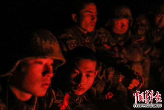 •     夜晚在巡逻路上驻扎,战士们围坐在火边取暖。