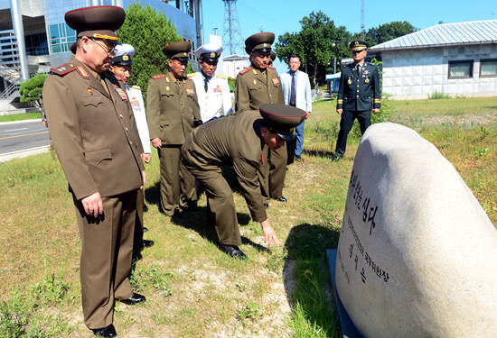 7月31日,韩朝双方在板门店举行第九次将军级军事会谈,重点讨论在板门店联合警备区内试点解除武装,把整个非军事区打造成真正和平地区的方案,以落实《板门店宣言》中的军事协议事项。视觉中国供图