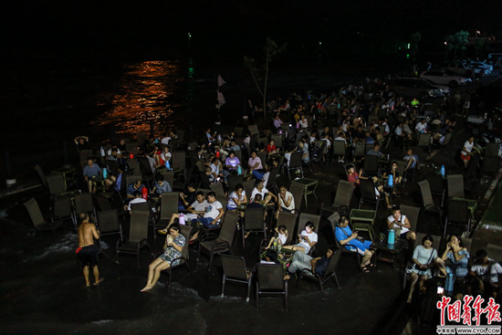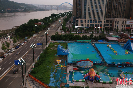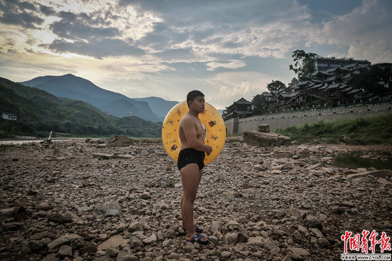 云南省昭通市水富县,长江上游金沙江畔,市民在水中纳凉。金沙江、横江、长江三江在水富交汇。