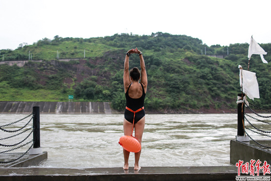 云南省水富县金沙江畔,53岁的当地人潘静在热身。