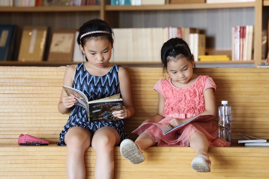 8月5日,两位小朋友在位于重庆市南岸区南滨路的精典书店内阅读。
