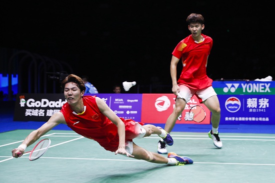 2018羽毛球世锦赛男双决赛中国选手李俊慧/刘雨辰2∶0战胜日本选手嘉村健士/园田启悟夺冠。图为李俊慧(左)奋勇救球。视觉中国供图