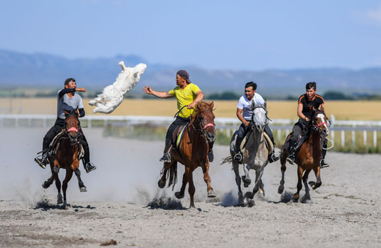 在新疆昭苏县天马旅游文化产业园,马术表演队在为游客表演“马背叼羊”。新华社记者 胡虎虎/摄