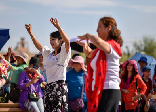 在新疆喀什老城开城仪式上,游客和老城居民一起跳起了舞蹈。新华社记者 赵戈/摄