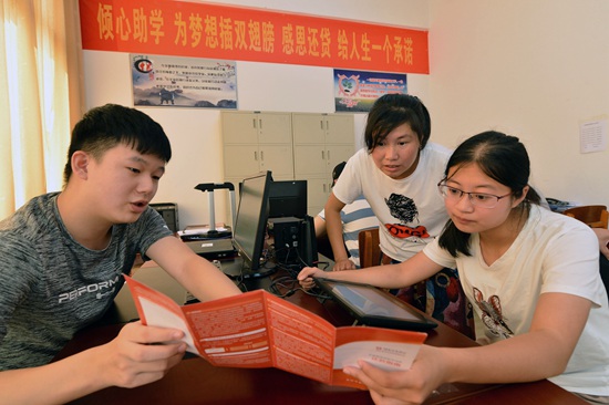 8月9日,在湖北省保康县教育局学生资助管理中心,工作人员(左一)向学生和家长讲解助学贷款相关政策。湖北省保康县教育部门近日启动2018大学生生源地信用助学贷款工作,为当地1000多名通过审核的家庭经济困难的新生和在校生办理生源地国家助学贷款手续,助他们圆大学梦。杨韬/摄(新华社发)