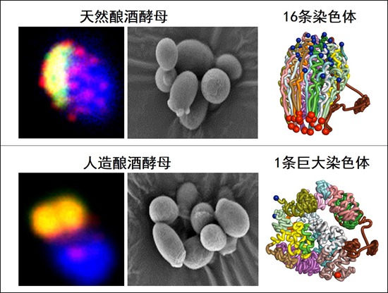 人造单染色体酵母与天然酵母细胞对比图,两者形态相似,但染色体的三维结构有巨大改变。中国科学院分子植物科学卓越创新中心/植物生理生态研究所供图