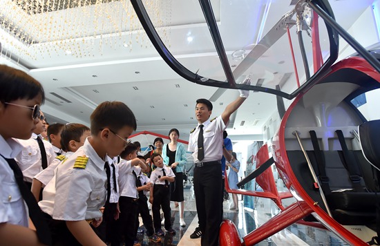 8月8日,来自江苏扬州市汶河街道树人苑社区的“小小机长”们,在了解学习小型飞机的机身结构、飞行性能等航空知识。视觉中国供图