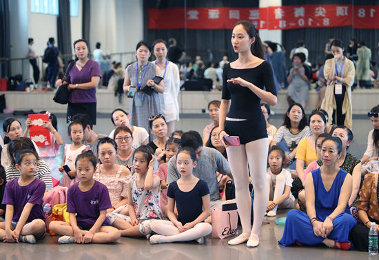 8月12日,一名舞蹈爱好者在芭蕾舞公益课堂上提问。当日,“2018顶尖舞者巡回课堂”在上海推出“公益课堂”,向社会公众免费提供现场教学实践课。80多名“秒抢”到上课名额的舞蹈爱好者,在公益课堂上向优秀芭蕾舞演员学习芭蕾舞基本动作,体会芭蕾艺术的独特魅力。