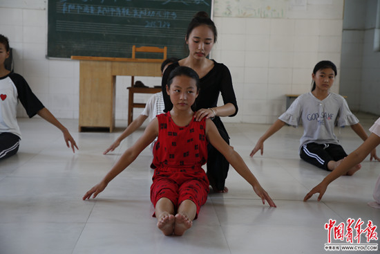7月25日,在阜阳市颍州区马寨乡皮楼小学,葛晴在教孩子们舞蹈基本功。中国青年报·中青在线见习记者 王海涵/摄