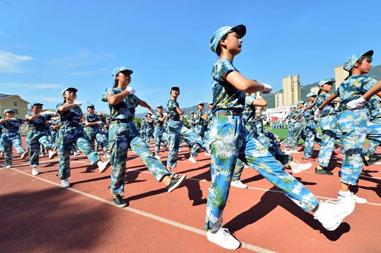 8月28日,新生在湖北省襄阳市保康县第一中学参加军训。新学期在即,各地学校组织学生进行军事训练活动,强健体魄,磨练意志。杨韬/摄(新华社发)
