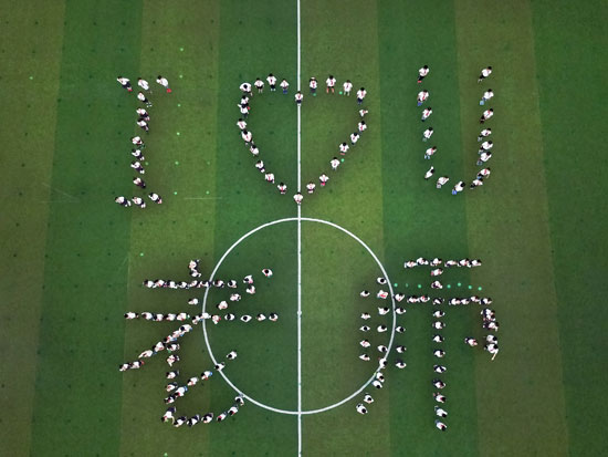 合肥市华山路小学学生在操场上拼出意为“我爱你,老师”的汉字和字母,表达对老师的感恩和祝福,迎接教师节。 视觉中国供图
