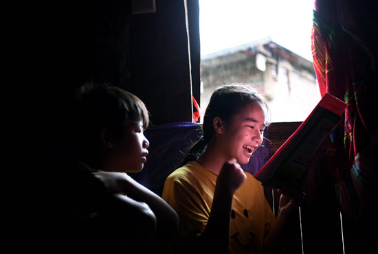 9月1日,梁宏月(右)带着弟弟在窗边大声朗读入学通知书,鼓励弟弟在家也要勤奋读书。