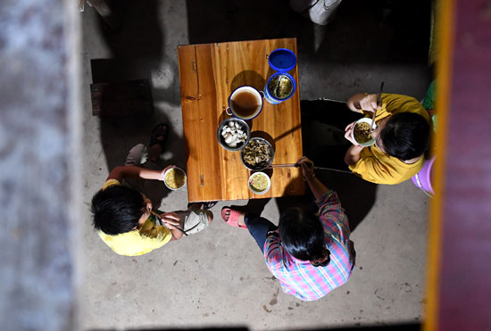 一家三口坐在饭桌前“打油茶”,为即将外出求学的梁宏月饯行。