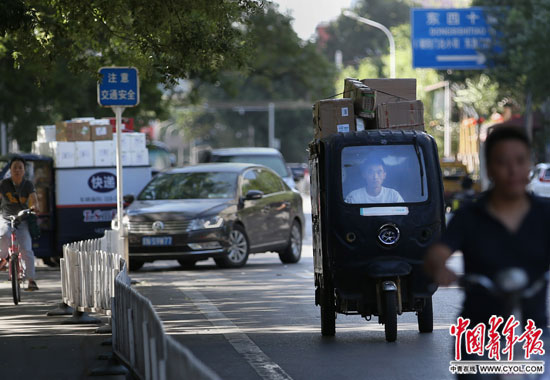 9月6日,北京街头,一位快递小哥驾驶着满载货物的电动车行驶在路上。中国青年报·中青在线记者 陈剑/摄