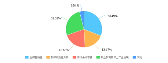 教师卷:您认为高职教育的根本难点在于?1509位受访教师,73.49%认为是生源素质差,其次是职业教育跟不上产业发展。(制图:魏其濛 张茜)