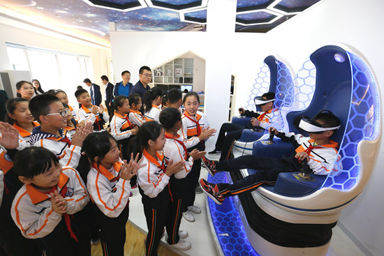 10月15日,青岛市即墨区德馨珑湖小学的学生在社区科普馆进行VR体验。