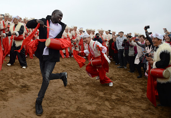 在陕西延安安塞区南沟进行的一场腰鼓演出结束后,一名外国游客与当地腰鼓手共同打起了腰鼓(10月20日摄)。陕西延安安塞区是中国西北地区黄土高原文化保存最好,民间艺术最集中、最具代表性的区域之一。近年来,安塞依托全国民间艺术之乡的优势,围绕腰鼓、民歌、剪纸、绘画、曲艺五张文化名片,推进“文化+农业+旅游”的融合发展战略,助力乡村旅游发展。