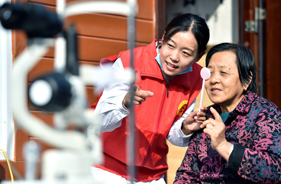 10月16日,在河北省石家庄市桥西区志愿服务广场,石家庄市一家医院的志愿者为老人检查视力。重阳节前后,各地举办丰富多彩的活动,弘扬敬老爱老的传统美德。章朔/摄(新华社发)