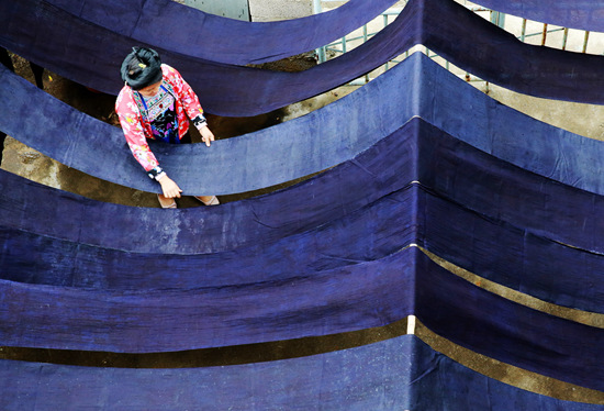 苗族妇女在晾晒染过的棉布。