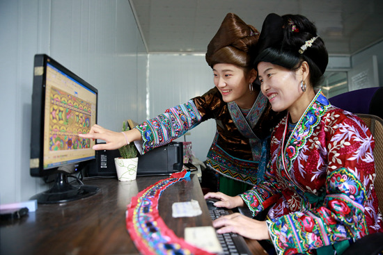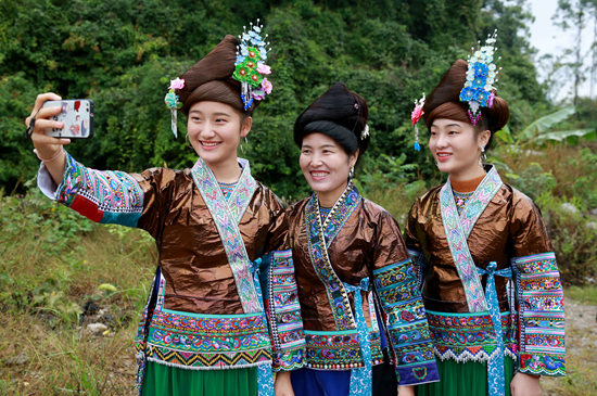 苗族妇女穿着亮布衣拍摄照片,准备发布到互联网平台上做宣传。