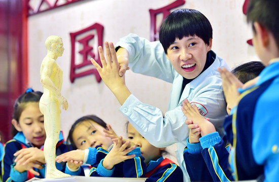10月22日,河北石家庄市桥西区裕西社区卫生服务中心国医堂的医生向学生介绍人体穴位知识。当日是世界传统医药日,各地纷纷举行与中医药相关的活动,让人们体验中医文化,感受中医魅力。张晓峰/摄(新华社发)