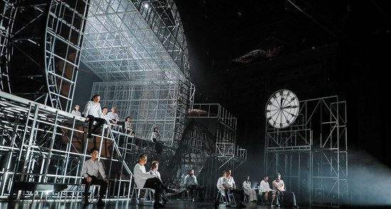 戏剧经典进行一场“整容式亮相”,开幕大戏《茶馆》,台上密密麻麻的现代钢架构成一个19米长、16米深、11米高的巨型圆环,并于结尾时缓缓转动起来,文章饰演的掌柜王利发在里面跑动、呼叫,渺小的人影仿佛快被时代巨轮吞噬;契诃夫的《樱桃园》,伴随着“樱桃园时代”消逝的意象,竟是投影在床帘上的二次元游戏、“红楼梦”字样和魔幻电音……