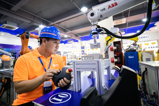 10月21日,在2018年东莞工业机器人技术应用技能大赛上,选手在操作机械手。视觉中国供国