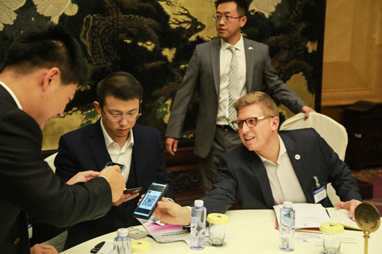 10月19日,在北京举办的中美投资人与创业者对话会暨中美青年创业先锋交流营上,一位美国青年代表与中国青年代表互相添加微信。吴问/摄