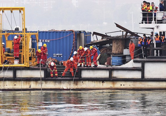 搜寻坠江者,全力打捞遇难者遗体成为重中之重。第三天,潜水员潜入位于长江二桥上游约28米、水深约71米处的坠江公交车内,搜寻救捞被困人员,并进行车辆栓套、固定。