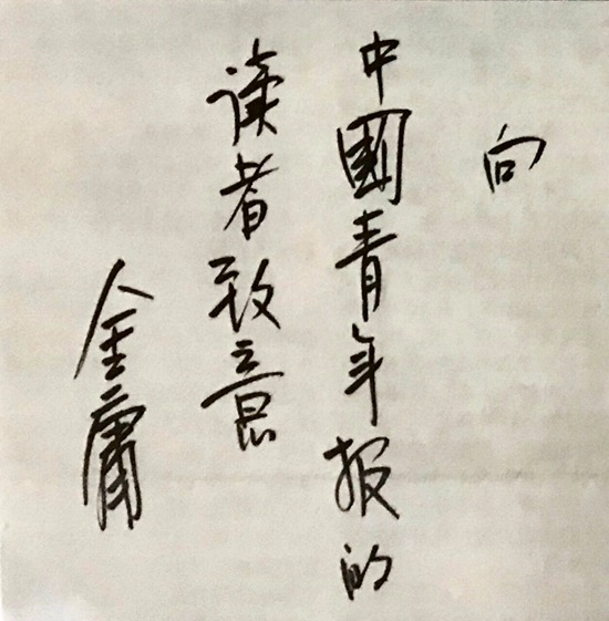 1999年8月29日,在中央电视台一间小小的会客室里,金庸先生曾接受本报记者的独家采访,寄语青年“为国为民,侠之大者”,并欣然题词:“向中国青年报的读者致意。”采访中,金庸对本报的大学生读者提出自己的希望:“能接受大学教育是一个非常难得的机会,能得到这个机会的人比例很少,要充分利用时间,千万不要错过这个机会。在大学念书不单单是考试的问题。除了求学,还有做人的学问。”