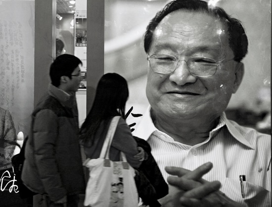 2008年1月9日,北京,在中国国际展览中心举行的北京图书订货会上,人们走过作家金庸的巨幅图书广告。视觉中国供图(资料照片)