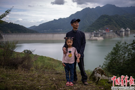 9月16日,四川省都江堰市龙池镇查关村,59岁的陈明和5岁的外孙女站在紫坪铺大坝前。2006年,岷江上修建大坝,陈明一家搬迁后盖起了新房,开过饭店、小卖部。如今他家周围都成了旅游区。