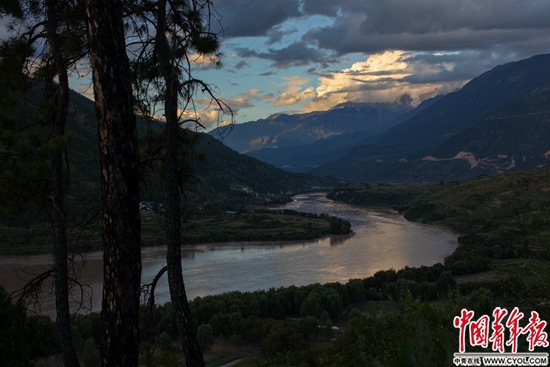 傍晚的金沙江,远处是玉龙雪山。