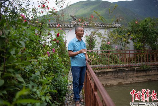 云南省丽江市玉龙纳西族自治县石镶村,66岁的姚树贤在自家院子里。院里种植了上百种花,修建了引水系统,他在这里接待了不少来自全国各地的朋友。