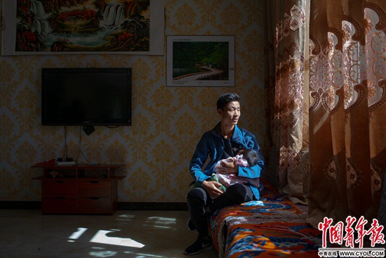 四川省甘孜藏族自治州康定市雅拉乡木格措,24岁的罗绒贡布抱着女儿在自家酒店里。2016年,他借款50多万元在大渡河上游的木格措风景区旁盖了一间酒店,一家十几口人一起打理。