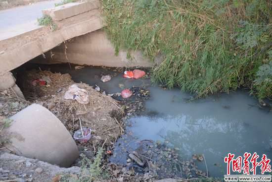 在围绕河南汝州粪堆赵村的自然流水沟下游处,水质浑浊,呈奶蓝色。魏晞/摄