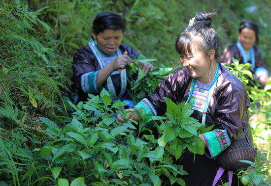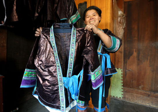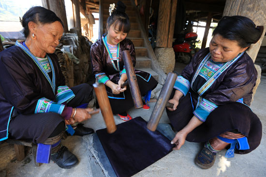广西融水苗族自治县苗族群众有手工制作亮布的传统。人们使用天然原料将布料染色,晾干后涂蛋清,用木槌反复捶打,可以使布面长久保持光泽。近年来,随着当地旅游产业的发展,亮布制作的衣服受到游客青睐,当地传统亮布制作技艺也焕发出新的生机。石峰/摄