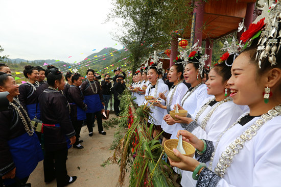 11月11日,在贵州省榕江县忠诚镇定达侗寨,侗族妇女向客人敬拦门酒。