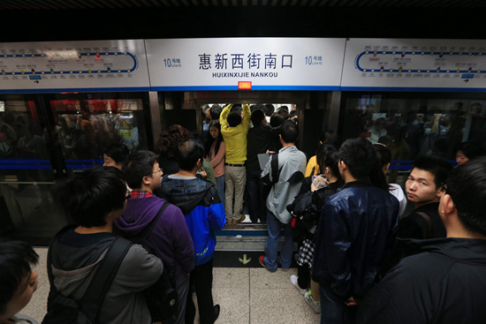 在北京地铁1号线,1分钟意味着有超过1100人上不了车。这些人挤压在各个站台,是地铁运营部门最不愿看到的危险状况之一。