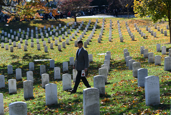 11月11日,一名男士在美国弗吉尼亚州阿灵顿国家公墓参观。当天是美国退伍军人日,美国各地举行各种活动纪念退伍军人和阵亡将士。新华社记者 刘杰/摄